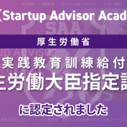 スタートアップ及び新規事業の成長支援をする「スタートアップアドバイザー」育成のためのオンラインスクールSAA(Startup Advisor Academy、以下「SAA」)が、経済産業省「第四次産業革命スキル習得講座」(Reスキル制度)に採択され、厚生労働省による「専門実践教育訓練給付制度 厚生労働大臣指定講座」にも認定されました。これにより、受講生は一定の条件を満たすことで最大80%*の受講費の助成を受けながら、実践的な事業創出・DX推進スキルを身につけることが可能となります。