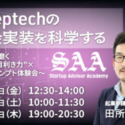 | 19:50〜20:00 | SAA(Startup Advisor Academy)紹介・質疑応答 | – プログラム概要とBatch8募集案内- 受講生の声(公的機関・地域支援者の事例)- 質疑応答 |