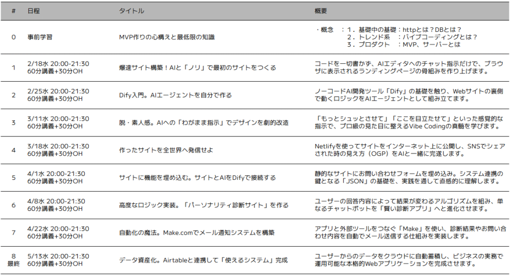• 全8回の伴走: 講義とフォローアップを通じ、エラーが出た際の対処や、AIとの対話のコツ(バイブス)を養う